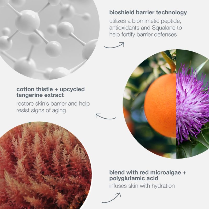 Barrier-restoring Cotton Thistle and upcycled Tangerine Extract help skin recover and resist signs of ageing. A blend with Red Microalgae hydrates for healthy-looking, more supple skin, while botanical extracts help soothe.